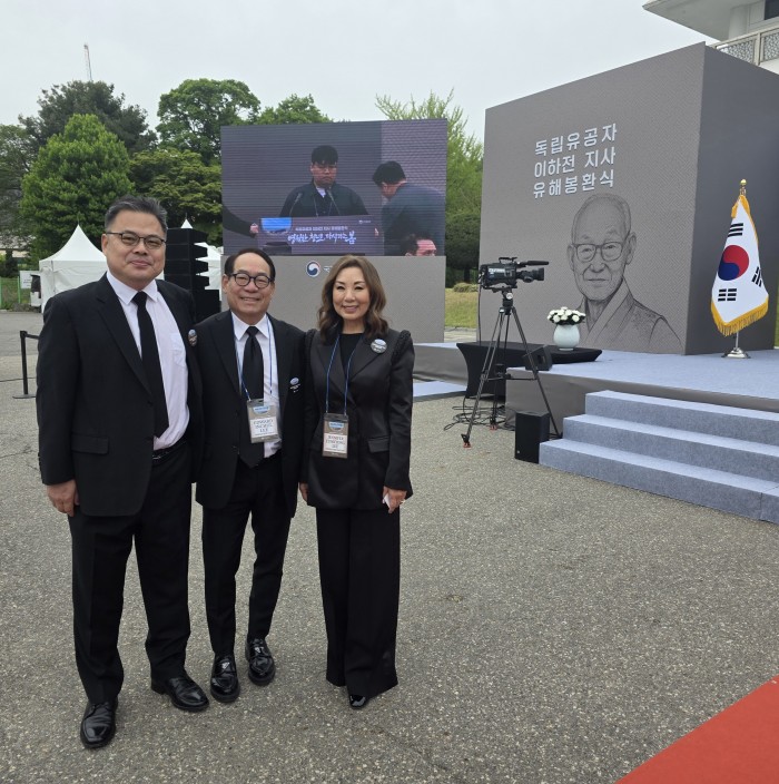 왼쪽부터 유관순열사기념사업회 유시우 부회장, 이하전 지사의 아들 에드워드리(이인철), 부인 제니퍼리(이은경)가 기념촬영을 하고 있다. / 사진=유관순열사기념사업회