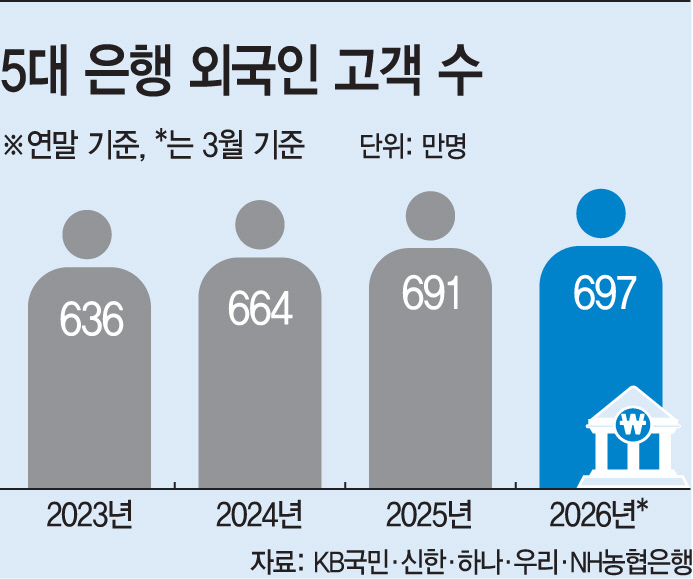 22일 금융권에 따르면 5대 은행(KB국민·신한·하나·우리·NH농협)의 외국인 고객 수는 2026년 3월 말 기준 696만6721명으로 집계됐다. 2025년 말(690만6972명)과 비교하면 3개월 만에 약 6만명 늘어난 것이다. 외국인 고객은 2023년 636만명에서 2024년 664만명으로 점차 확대되며 연간 약 4%대 증가세를 이어가고 있다. 이 같은 흐름이 지속될 경우 올해 상반기 내 700만명 돌파가 가능할 것으로 보인다.