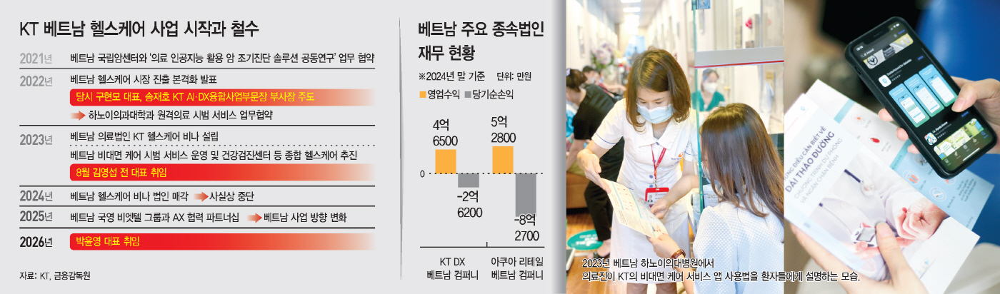 구현모 대표 재임 시절 KT는 2023년 1분기 베트남 의료법인 'KT 헬스케어 베트남'을 설립했다. AI 등 디지털 기술을 기반으로 현지에서 종합 헬스케어 사업을 추진하기 위해서였다. 당시 KT는 현지에서 건강검진센터와 의료 AI를 아우르는 사업을 그렸다. 구 전 대표는 헬스케어 작업을 차근차근 진행했다. 그 직전 해에 KT는 베트남 하노이의과대학과 원격의료 시범 서비스를 위한 업무협약을 체결하는 등 의료사업 본격화를 염두에 둔 작업들을 진척시키고 있었다. 법인까지 설립한 후 KT는 수도 하노이에 3300㎡ 규모의 건강검진센터를 짓는 계획도 세웠고 이를 운영할 인력 채용도 진행 중이었으며 인테리어 작업도 상당 수준 진행된 상태였다. 그런데 이를 바로 이듬해인 2024년 전면 백지화하고 법인도 매각했다.