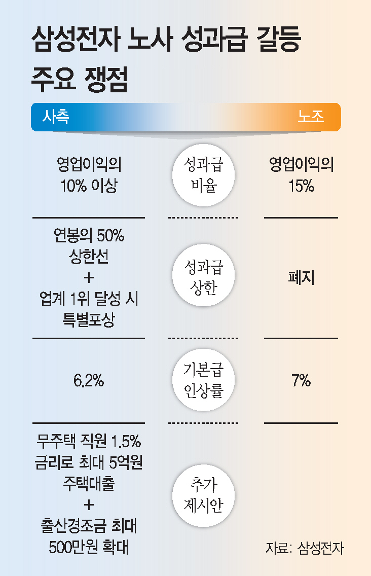 현재 노조는 영업이익의 15%를 성과급으로 요구하고 있다. 여기에 연봉의 50%로 제한하고 있는 성과급 상한선을 폐지하고, 임금 인상률도 사측이 제시한 6.2%를 넘어서는 7%로 합의할 것을 강조한다. 사측과 합의가 이뤄지지 않으면 다음 달 21일부터 18일간 총파업에 나설 것을 예고하고 있다.