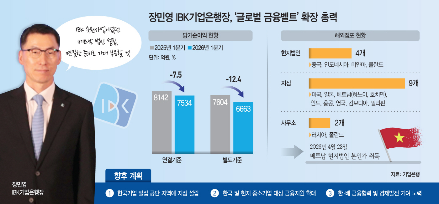 이에 기업은행은 베트남 법인 출범을 계기로 해외 사업 체질 개선에 나선다는 방침이다. 지난해 11월 영업인가를 취득한 폴란드 법인의 안정화를 추진하는 한편, 미국 남부 조지아·텍사스 지역에서 기업금융 전담 인력(RM)을 운영하는 등 영업 기반 확대에도 속도를 낼 계획이다. 기업은행 관계자는 "미국·일본·인도 등 9개 지점과 2개 사무소 등을 활용해 글로벌 영업망을 더욱 강화하고 수익 기반도 안정화할 계획"이라며 "베트남 법인 출범을 계기로 해외 사업 경쟁력을 한층 끌어올리겠다"고 말했다.