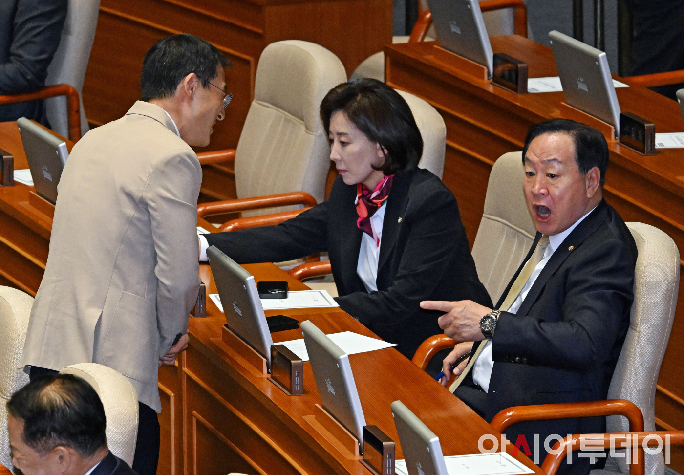 한기호 국민의힘 의원(오른쪽)이 28일 국회에서 열린 본회의에서 인사하러 찾아온 더불어민주당 울산시장 후보인 김상욱 의원에게 호통을 치고 있다.