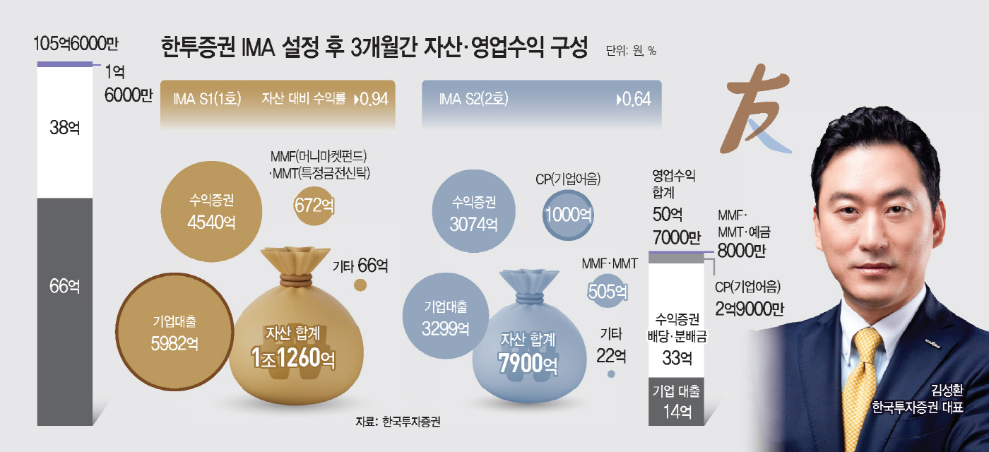 28일 한국투자증권에서 작년 12월 출시한 IMA S1(1호)의 설정 후 3개월간 운용 현황을 보면 전체 자산 1조1260억원 중 기업대출이 5982억원(53.1%)를 차지하며 가장 큰 비중을 점하고 있다. 그 뒤를 해외 펀드와 같은 수익증권(4540억원·40.3%)이 잇고 있어, 기업대출과 수익증권이 전체 자산의 90% 이상을 점유하는 구조다. 안정 자산으로 분류되는 머니마켓펀드(MMF)·특정금전신탁(MMT) 등 나머지 자산은 총 738억원(6.6%)에 불과하다.