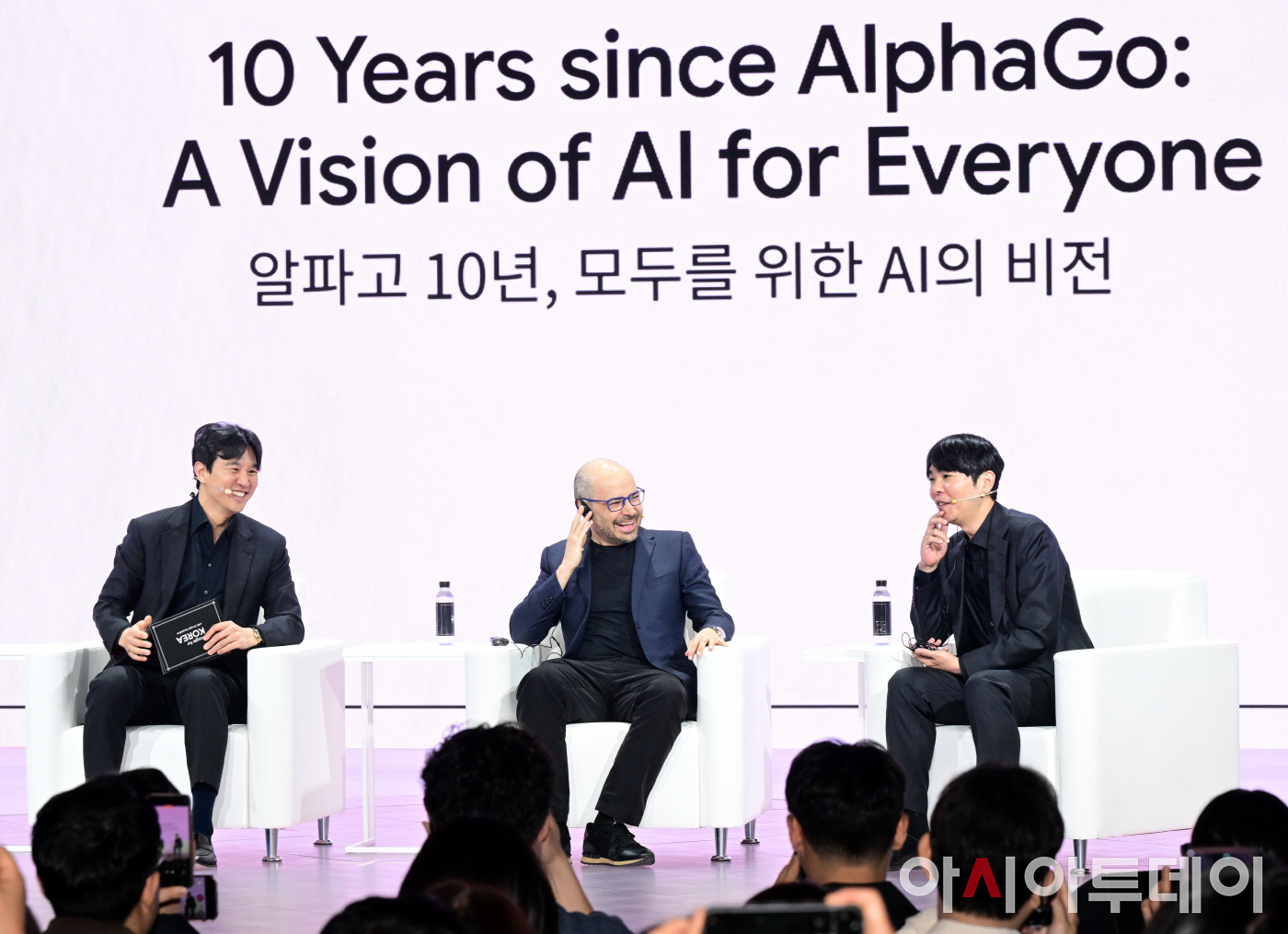 이날 현장에서 데미스 하사비스(Demis Hassabis) 구글 딥마인드의 공동 창업자 및 CEO와 이세돌 사범이 알파고 10년, 모드를 위한 AI의 비전을 주제로 대담을 하고 있다.
