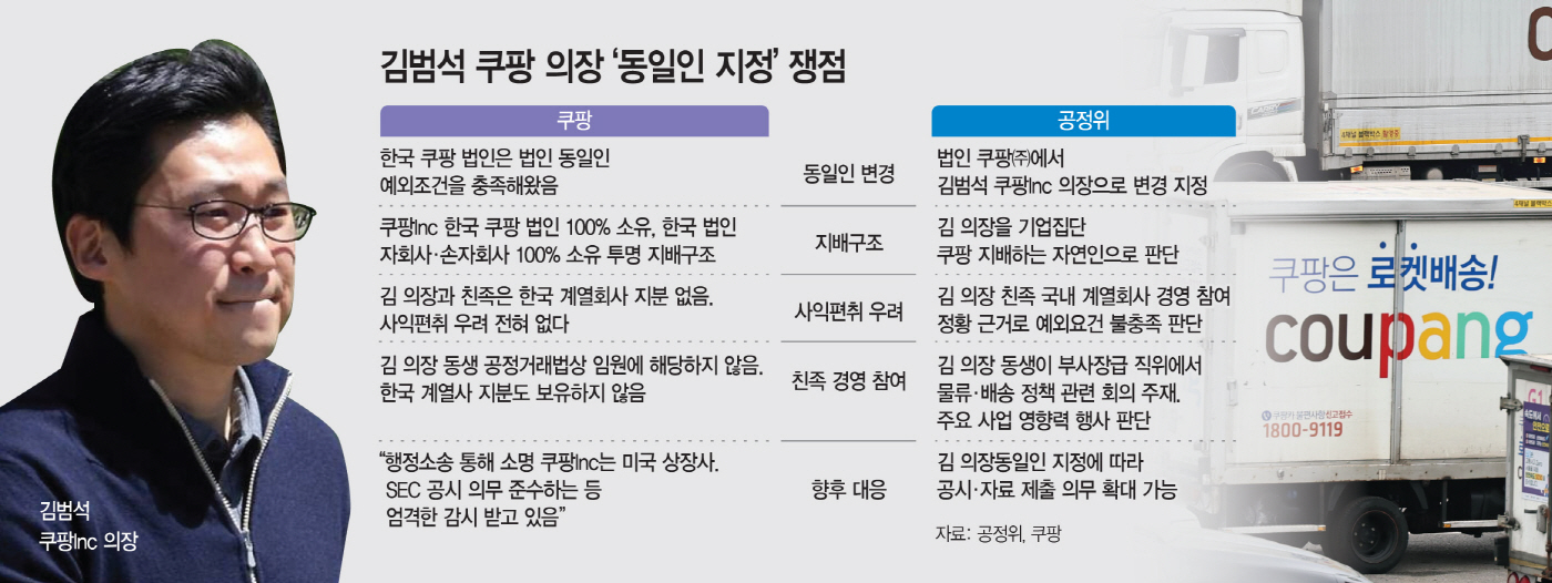 공정위는 김 의장의 친족이 국내 계열회사 경영에 사실상 참여했다고 판단했지만, 쿠팡은 김 의장과 친족이 한국 계열회사 지분을 보유하지 않은 만큼 사익편취가 발생할 구조가 아니라고 반박하고 있다. 미국 상장사를 정점으로 한 쿠팡의 지배구조에 국내 '총수 규제'를 적용하는 것이 타당한지를 두고 법정 공방이 불가피해질 전망이다.