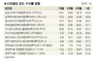 이 펀드의 1개월 6개월 1년 수익률을 각각 15.41%, 66.78%, 39.16%로 같은 기간 국내주식형 펀드 평균 수익률 11.53% 48.07% 25.74%를 앞지른다.