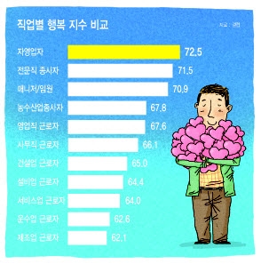 이번 조사 결과 자영업자의 경우 업무시간이 다른 직종에 비해 길고 수입도 전문직과 관리직에 비해 적지만 상사로부터 받는 스트레스가 없기 때문에 만족도는 오히려 높은 것으로 나타났다.