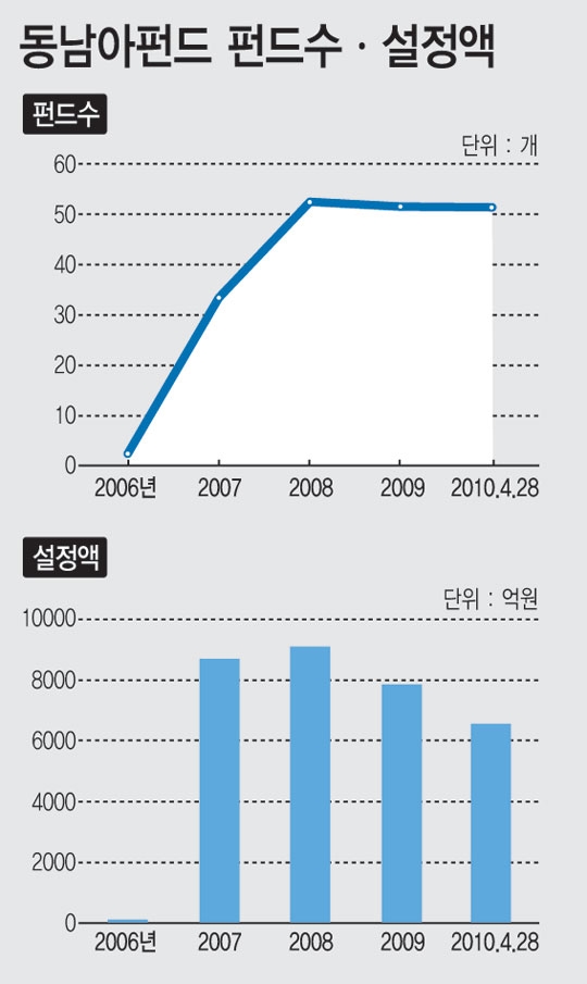 2006년부터 설정되기 시작한 동남아펀드는 2007년에 설정액이 9000억원대에 육박하는 수준으로 급증한 이후 작년부터는 8000억원대에서 정체돼 있는 상태다.