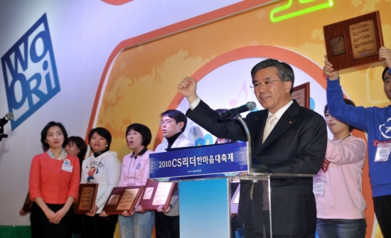 | 지난 4월 개최된 우리은행 CS리더한마음 대축제에 참석한 이종휘 행장이 파이팅을 외치고 있다. |