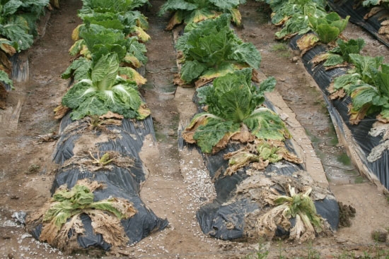 멀리서 보기에는 멀쩡해 보이는 배추밭을 기자가 가까이 다가가서 살펴보니 상태가 상당히 좋지 않은 배추밭이 많았다. 원형 탈모증에 걸린 듯 밭 곳곳이 듬성듬성 비어 있었고, 배추가 누렇게 변한 밭도 상당히 많았다.