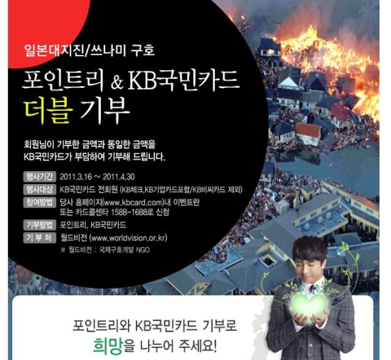 이 회사는 지난달 16일부터 국제구호개발기구 월드비전(World Vision)과 공동으로 일본 대지진과 쓰나미 피해 구호 지원을 위해 포인트리 기부 캠페인을 전개하고 있다.