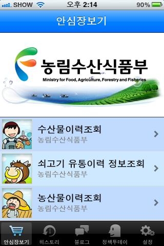 아이폰 안심 장보기 와 안드로이드폰 쇠고기 이력제 가 그것으로 안심 장보기는 농산물, 수산물, 쇠고기 등의 개체식별 번호를 통해서 구입하는 식품의 상세한 이력과 국산, 수입산 여부를 알아볼 수 있다.