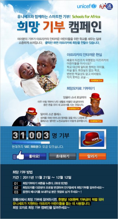 또 캠페인에 참여한 사람은 희망 모자 이미지를 자신의 프로필에 씌워 희망 기부 캠페인을 알릴 수 있다. 참여인원 한명당 100원씩 기부금이 적립, 아프리카 어린이들을 돕는데 사용된다. 응모인원에 따른 그래프와 총 적립 금액이 실시간으로 공개된다.