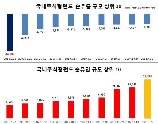 올 들어 국내 주식형펀드로 자금이 들어온 거래일은 17거래일 중 5거래일뿐이다. 지난 17거래일 동안 자금순유출 규모는 2조4835억원이나 됐다.
