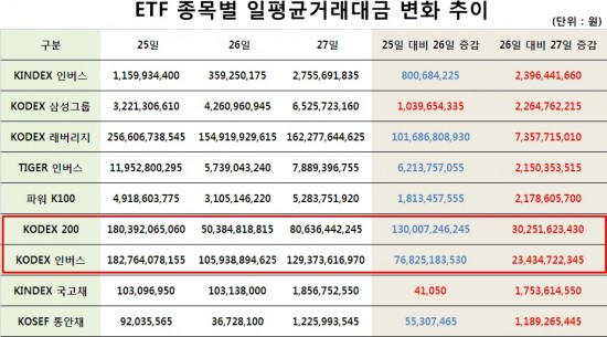 한국거래소에 상장된 111개 ETF 중 지난 25일 대비 26일 일평균거래대금이 증가한 종목은 41개였으나 26일 대비 27일 거래대금이 증가한 종목은 58개로 증가했다.