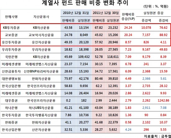 [아시아투데이=박병일 기자] 자산운용사와 계열사 관계에 있는 증권사들 중 KB투자증권이 계열사 펀드판매비중이 가장 큰 폭으로 증가한 것으로 나타났다.