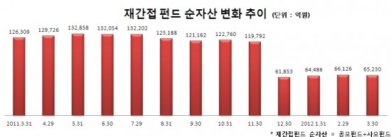 3일 금융투자협회에 따르면, 지난달 30일 기준으로 재간접펀드(사모펀드 포함)의 순자산은 6조5230억원을 기록해 지난해 4월 1일 12조6712억원보다 48.5%(6조1482억원)가 감소했다. 공모 재간접펀드 순자산만 봐도 17.9%(8158억원) 감소한 3조7480억원을 나타냈다.