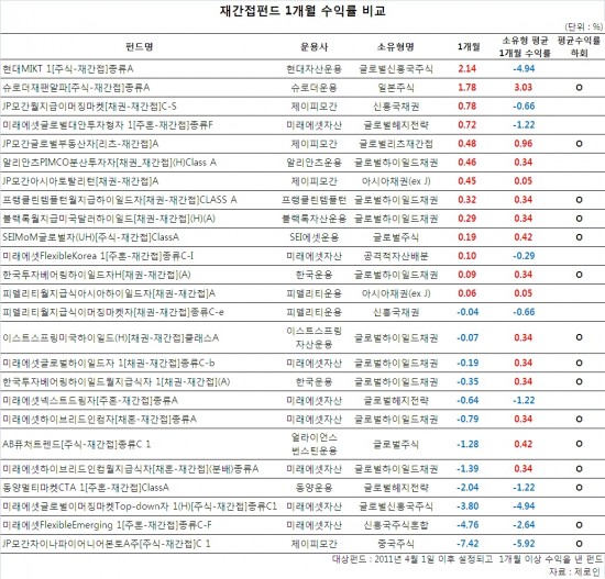 또 펀드 수익률이 각 펀드가 포함돼 있는 소유형 1개월 평균 수익률보다 저조한 성적을 낸 펀드도 15개(60%)였다.
