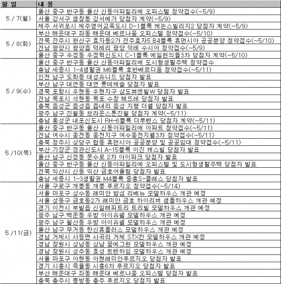 5일 부동산써브에 따르면 이번 주 분양시장은 청약접수 8곳, 당첨자 발표 14곳, 당첨자 계약 5곳, 견본주택 개관 9곳 등이 예정 돼 있다.