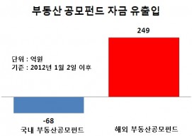 올해 들어 국내 부동산공모펀드에서 빠져 나간 자금은 68억원으로 부동산대출채권에 투자하는 상품에서 32억원, 부동산임대 상품에서 36억원이 유출됐다. 반면 해외 부동산공모펀드의 경우 글로벌부동산 상품에 대한 관심으로 249억원의 자금이 순유입되며 대조를 이뤘다.