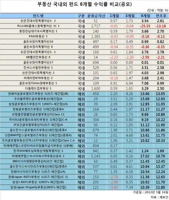 17일 펀드평가사 제로인에 따르면, 전날 기준으로 운용순자산 10억원 이상인 국내외 부동산 공모펀드는 국내펀드 14개, 해외펀드 19개로 모두 33개다.