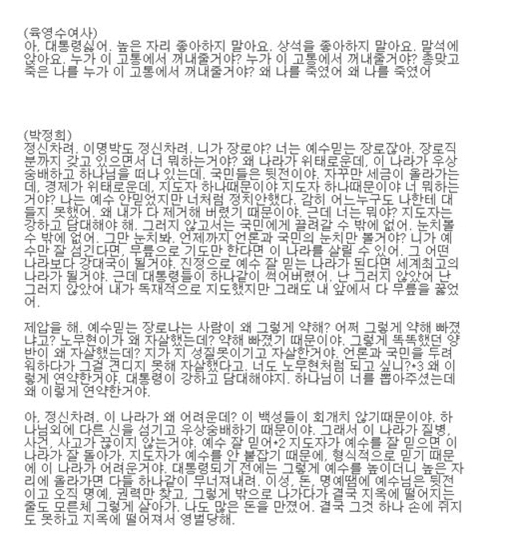 이 '지옥 생중계' 게시물은 "전갈이 앙드레김 혓바닥을 물어놨다", "육영수 여사를 막 끌고 가는데 바닥이 칼날이에요", "박정희는 예수 안 믿고 지옥에 떨어진 실패한 지도자야" 등 자극적인 표현을 서슴지 않는다.