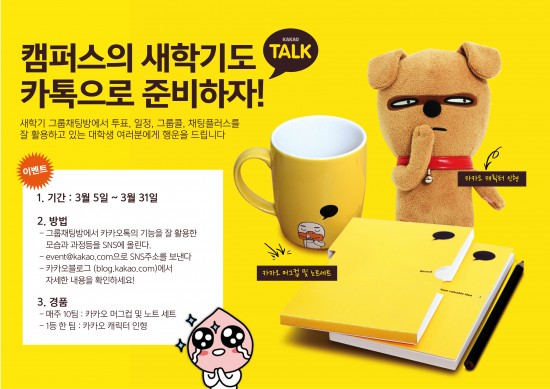 카카오는 새 학기를 맞아 이달까지 대학생들을 대상으로 카카오톡 그룹채팅방 활용 사례를 공모한다고 5일 밝혔다.