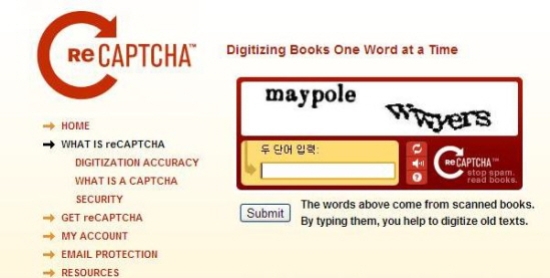 이 기술은 이용자가 왼쪽 단어를 제대로 입력하면 오른쪽 단어도 정확하게 썼을 것이라는 가정에서 출발한다. 오른쪽 단어는 그간 디지털화되지 않았던 문서의 일부분이다. 이를 통해 스팸을 막는 것은 물론, 사용자를 이용해 불분명한 문자를 판독시키는 ‘아르바이트’(?)를 하게 하는 일석이조의 효과를 누리고 있다. 이렇듯 구글은 공짜로 전자책을 만들고 있는 형국이다.