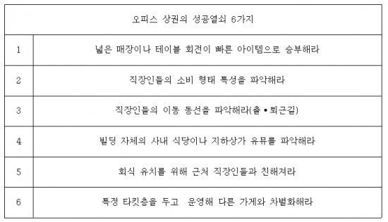 오피스 상권에서 매장을 운영하기 좋은 곳은 지하철과 버스정류장 등 교통시설과 업무시설 간 동선 상에 위치하거나 대형 빌딩 내 아케이드, 유동인구 유입이 많은 외식업 집중지역 등이 있다. 특히 빌딩 자체에 사내 식당이나 지하상가의 유무를 파악해야 한다.