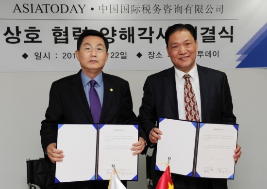 아시아투데이는 22일 서울 영등포구 여의도 본사에서 중국국제세무자문유한공사와 중국 진출 우리기업들이 절세혜택을 받을 수 있도록 컨설팅을 해주는 양해각서(MOU)를 체결했다.