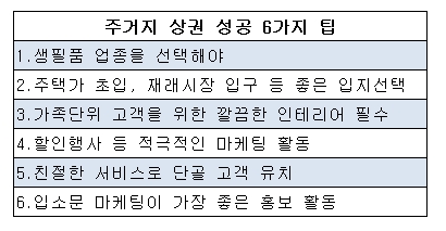 창업전문가는 “주거지 상권에서는 대기업과의 겹치는 아이템은 피해야 한다”며 “단골 고객 관리를 확실히 해야 하며 입소문 마케팅이 가장 좋은 마케팅 활동”이라고 조언했다.