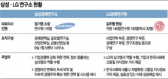 LG경제연구원도 규모면에선 삼성에 비할 바는 아니지만 비슷한 성격을 가진다. LG연구원은 1986년 삼성연과 비슷한 시기에 탄생했다. 이후 거시경제와 금융시장 분석, 산업의 미래 진화방향 연구 및 기업 경영 컨설팅 전반에 대한 연구를 지속해 오고 있다. 전체 직원수는 140명 정도로 연구원은 100명 수준이다. 박사급 인력은 30여 명 정도다.
