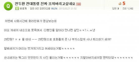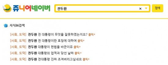스크롤을 내릴 필요도 없이 곧바로 비속어가 나왔다. 최상단 ‘지식in’ 코너에 ‘[사회, 도덕] 전두환 전 대통령 진짜 조져 버리고 싶네요’의 제목이 나타났다.