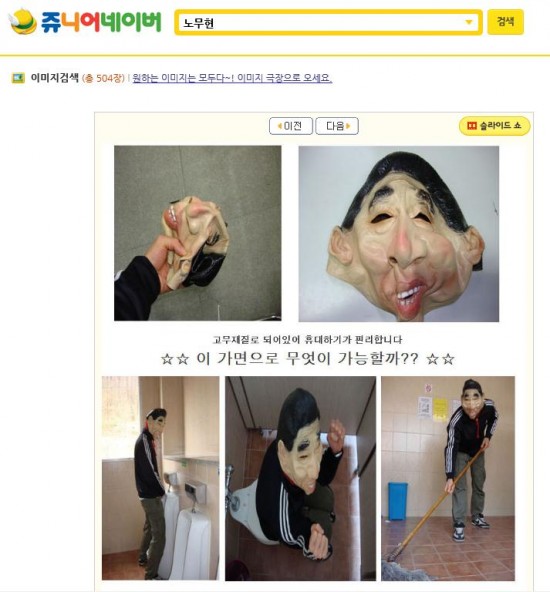 또 ‘이미지 검색’ 코너에는 ‘노무현 가면’이 등장한다. 기괴한 형상의 가면과 함께 이를 착용한 사람이 소변기에서 담배를 물고 대변기에 앉아 있는 사진은 고(故) 노무현 전 대통령을 조롱한다는 인상을 심어주기에 충분하다.