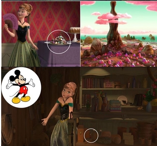 또 안나가 ‘For The First Time In Forever’를 부르는 장면에서 식탁 위의 초콜릿 접시는 주먹왕 랄프의 슈가 러쉬이며 안나가 소파 위로 뛰어오르며 흉내를 내는 그림은 ‘라푼젤’에서도 등장했던 장 오노레 프라고나르의 작품 그네를 모티브로 한 것과 동일하다.