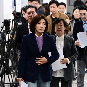 [포토] 기자회견장 들어서는 국민의힘 법사위원들