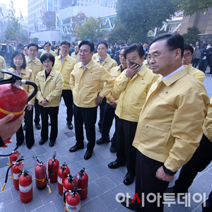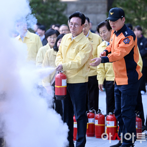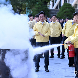 [포토]직접 소방호스로 불을 끄고 있는 김민석 총리와 장관들