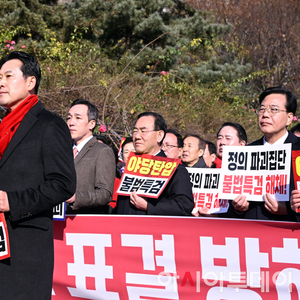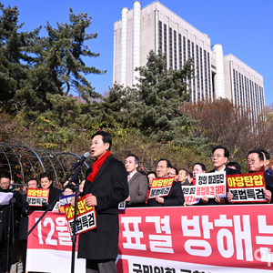 [포토]법원앞에서 규탄대회하는 장동혁 대표와 국민의힘 의원들