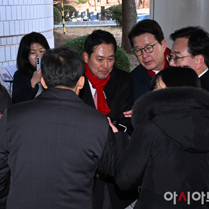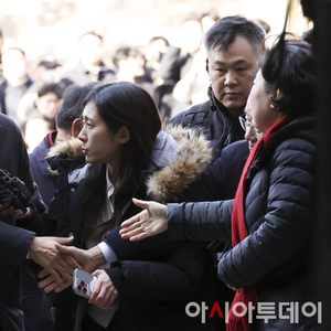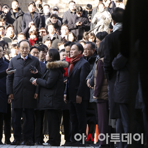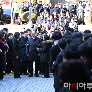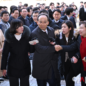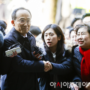[포토]동료의원와 악수하며 법원에 들어서는 추경호 의원