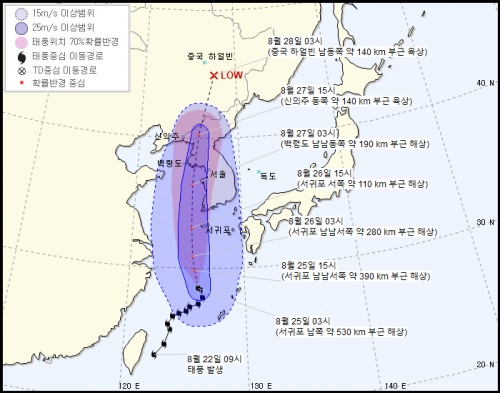 바비는 27일 오전 서울에 가장 근접하며, 이후 북한 황해도에 상륙한 뒤 내륙을 지나갈 것으로 예상된다.
