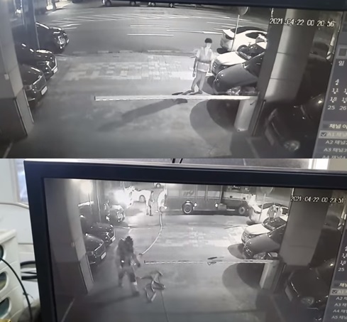이와 함께 공개된 폐쇠회로(CC)TV 영상에는 업무 도중 길 건너편 건물에서 불길이 치솟는 것을 발견한 한 남성이 휴대전화로 통화를 시도하는 모습이 담겼다.