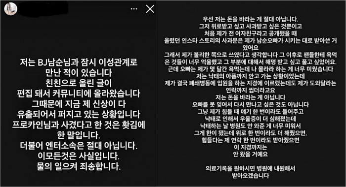 낙태 폭로전의 내막은 이렇다. 히콩은 최근 자신의 인스타그램 스토리에 BJ 남순과 이성 관계로 만난 적 있으며, 그의 아이를 임신했다가 낙태했다고 주장하는 글을 여러 차례 게재했다. 이 과정에서 BJ 남순과 나눈 것으로 추정되는 대화 등도 공개됐다.