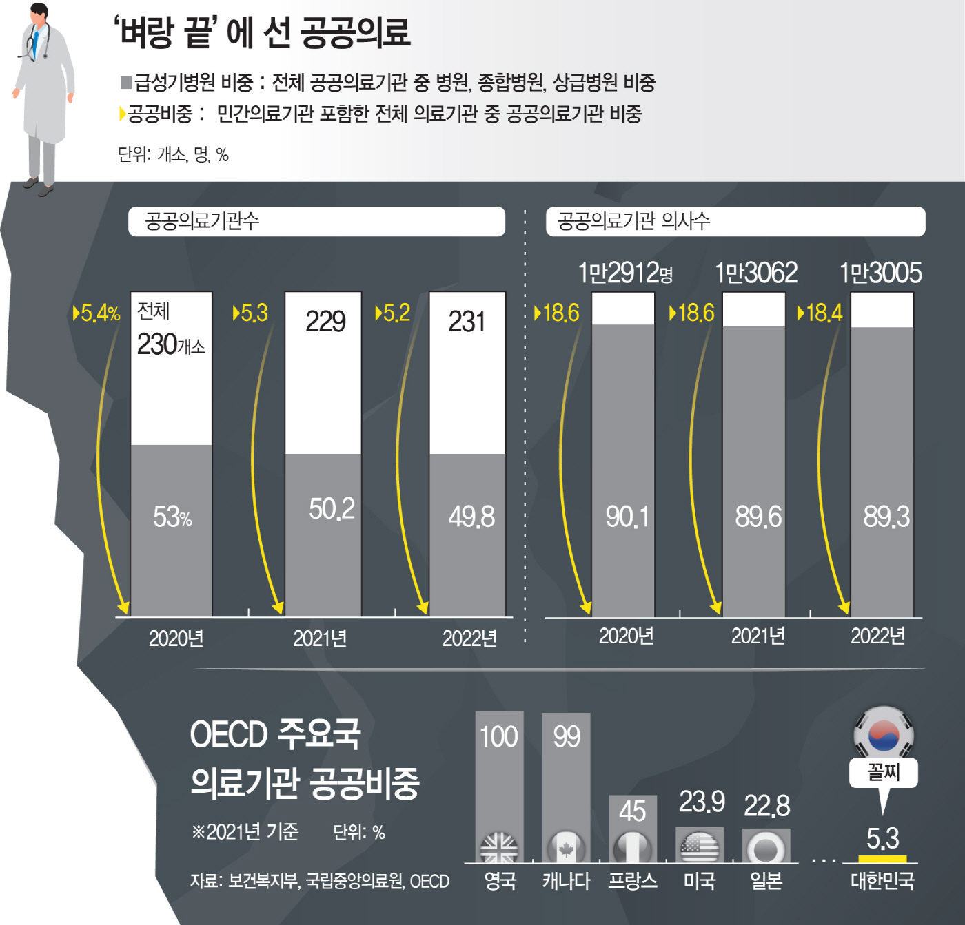 12일 보건복지부 등에 따르면 2021년 기준 한국의 '공공의료기관 비중'은 5.3%로 경제협력개발기구(OECD) 회원국 중 꼴찌다. 영국의 공공의료기관 비중은 100%이며 미국이 23.9%, 일본은 22.8%에 달했다.