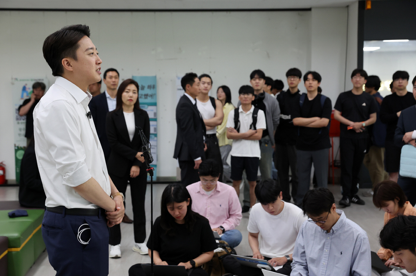 이준석 개혁신당 대선 후보(왼쪽)가 20일 광주 북구 전남대학교 학생식당 앞에서 취재진 질문에 답하고 있다. 이준석 후보는 이날 '학식먹자' 행사에서 학생들과 점심을 먹으며 대화를 나눴다. /연합