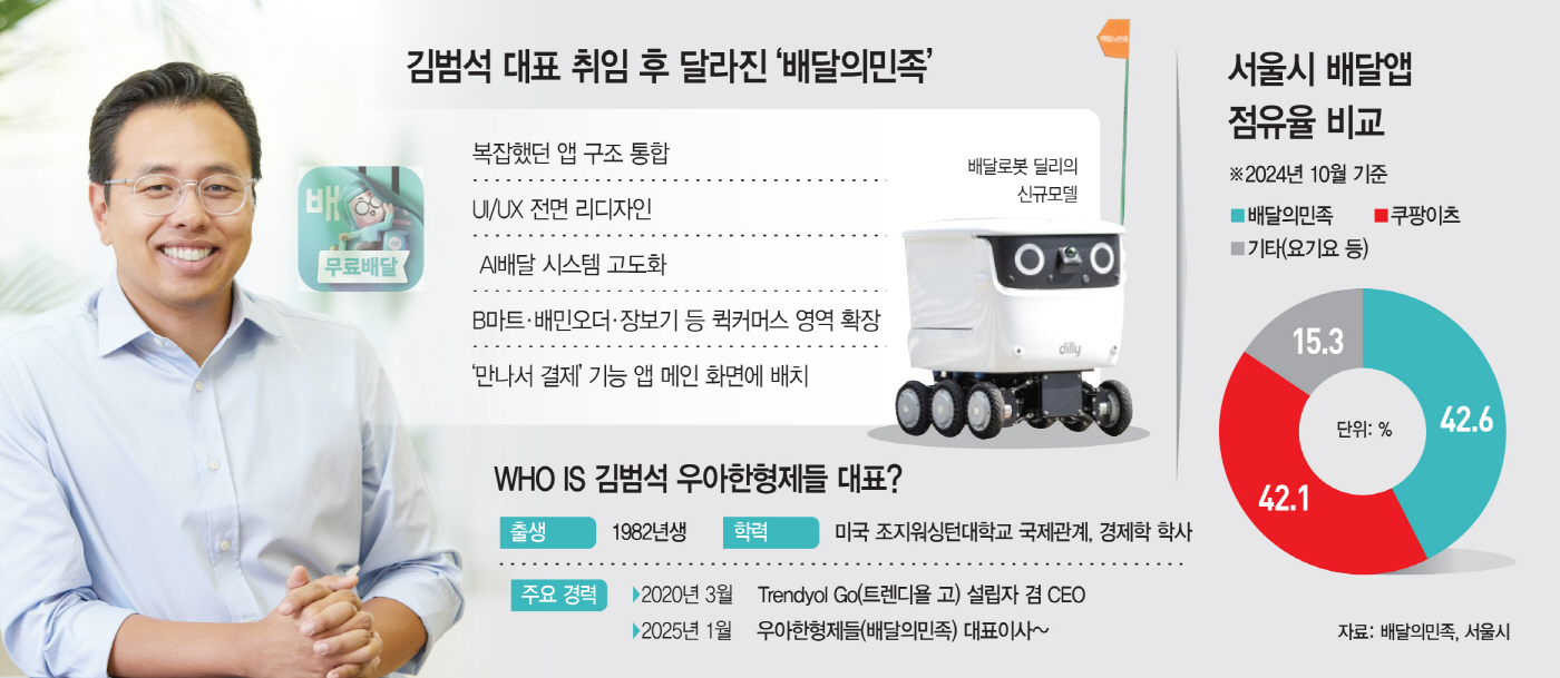 전국 단위로 보면 가게 자체 배달이 가능한 배달의민족이 월등히 앞서고 있지만, 최대 경쟁처인 수도권에서 비등한 모습을 보이고 있단 점에서 회사 전반에 위기감이 감돌고 있는 중이다. 이에 올 초부터 회사 경영을 맡기 시작한 김 대표는 경쟁사와 차별화된 아이디어를 서비스에 도입하는 등 고객 만족도를 끌어올리기 위해 전력을 다하고 있다.