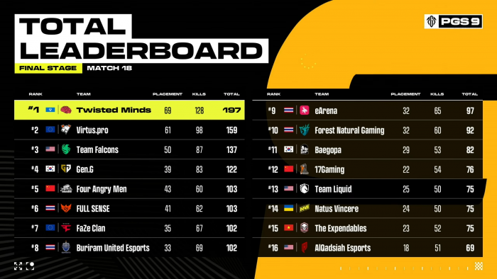 트위스디드 마인즈는 지난 PGS7과 PGS8에 이어 세 대회 연속 우승으로 'PGS 절대 강자'의 위용을 완성했다. 특히 에이스 이그잼플'은 39킬, 7646대미지를 기록하며 대회 MVP로 선정됐다. 그는 무려 4번의 PGS 우승에서 모두 MVP를 차지하는 전무후무한 기록을 세웠다.