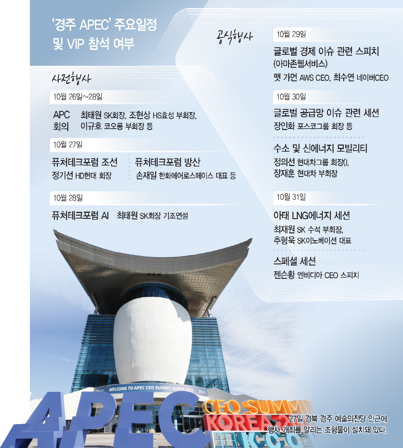 글로벌 경제 리더들이 이번 주 경주로 집결한다. 28일부터 31일까지 열리는 'APEC CEO 서밋 코리아 2025'는 단순한 외교 행사를 넘어, K-산업이 글로벌 시장에서 어떤 비전을 제시할 수 있을지를 가늠하는 핵심 무대가 될 전망이다.