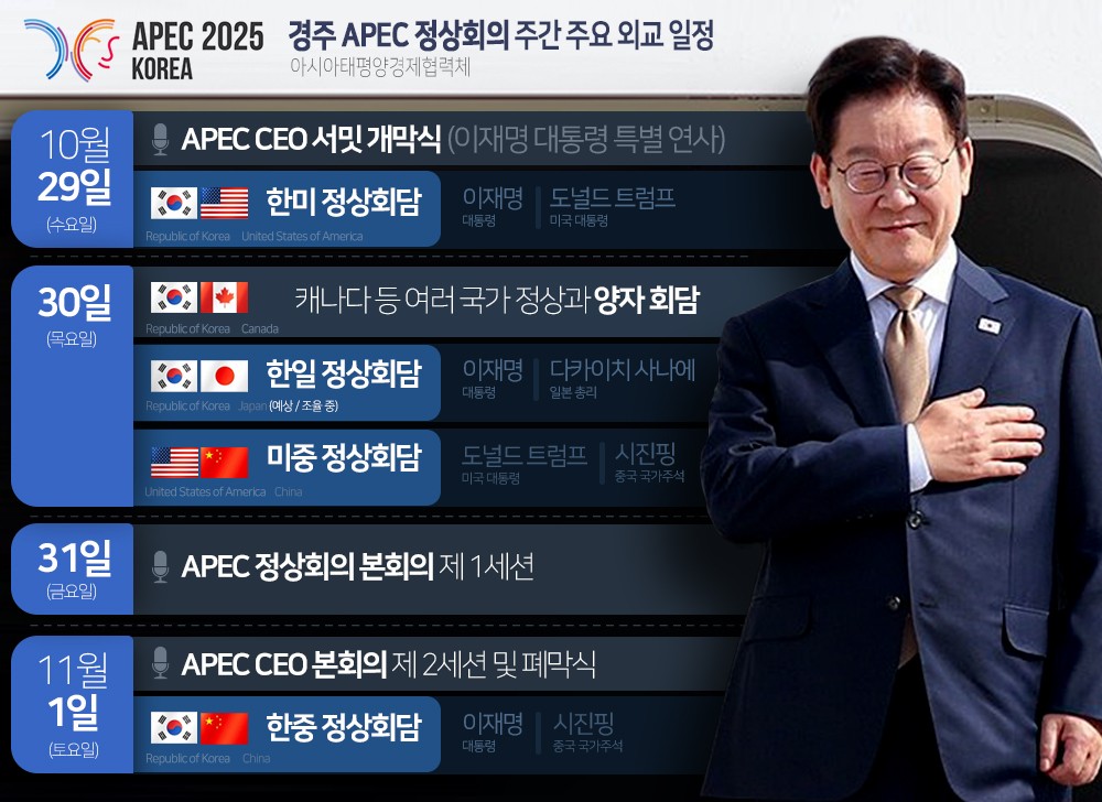 이재명 대통령이 29일부터 11월 1일까지 나흘간 이어지는 경주 아시아태평양경제협력체(APEC) 정상회의와 한미 정상회담 등 '외교 슈퍼위크' 일정에 돌입한다.